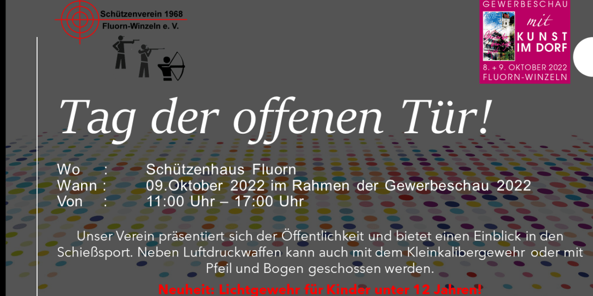 am Sonntag, den 09.10.22 öffnet der Schützenverein Fluorn-Winzeln im Rahmen der Gewerbeschau seine Pforten, um einer breiten Öffentlichkeit ihre sportlichen und ihre gesellschaftlichen Angebote zu präsentieren. Den interessierten Besuchern werden verschiedene Disziplinen im Sportschießen vorgestellt. Neben dem Schießen mit Luftdruckwaffen haben unsere Besucher auch die Möglichkeiten mit Kleinkaliber oder Pfeil- und Bogen zu schießen. Neuheit in unserem Sportangebot ist das